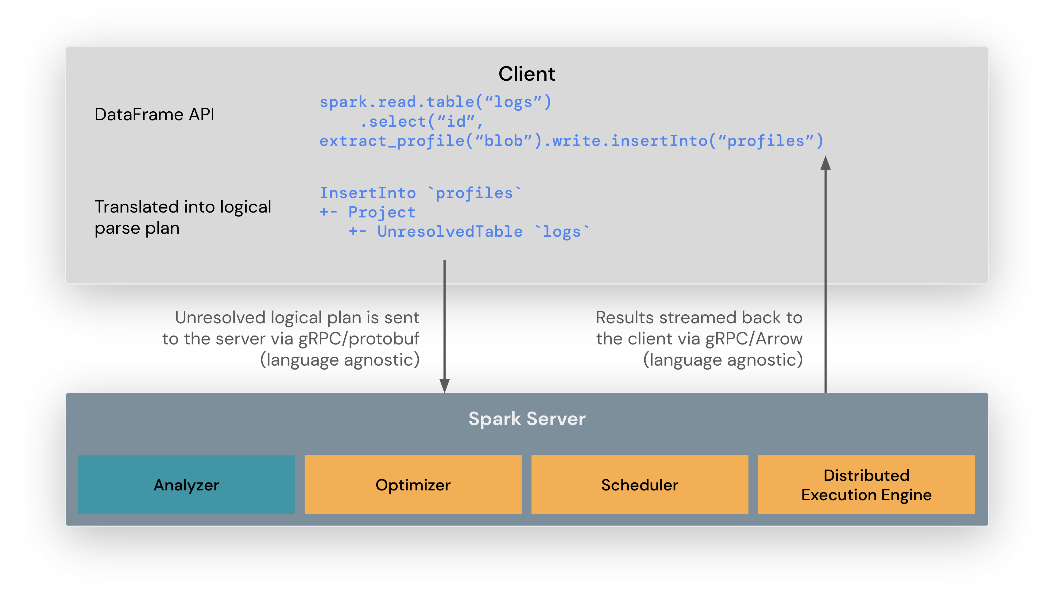 The Spark Connect endpoint embedded on the Spark Server receives and translates unresolved logical plans into Spark’s logical plan operators. This is similar to parsing a SQL query, where attributes and relations are parsed and an initial parse plan is built. From there, the standard Spark execution process kicks in, ensuring that Spark Connect leverages all of Spark’s optimizations and enhancements. Results are streamed back to the client through gRPC as Apache Arrow-encoded row batches.