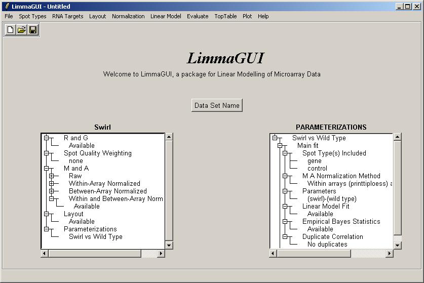 Once the data set has been loaded, its name is displayed on top of the left status window. The status window shows that Red and Green background-corrected intensities (R and G) have been loaded, and that there is no spot-quality weighting. The data set name can be later modified with the "Data Set Name" button. The data set name is not the same as the file name, displayed in the title bar. For example, the same data set (Swirl) could be saved at two different stages of the analysis, e.g. SwirlArraysLoaded.lma and SwirlLinearModelComputed.lma.