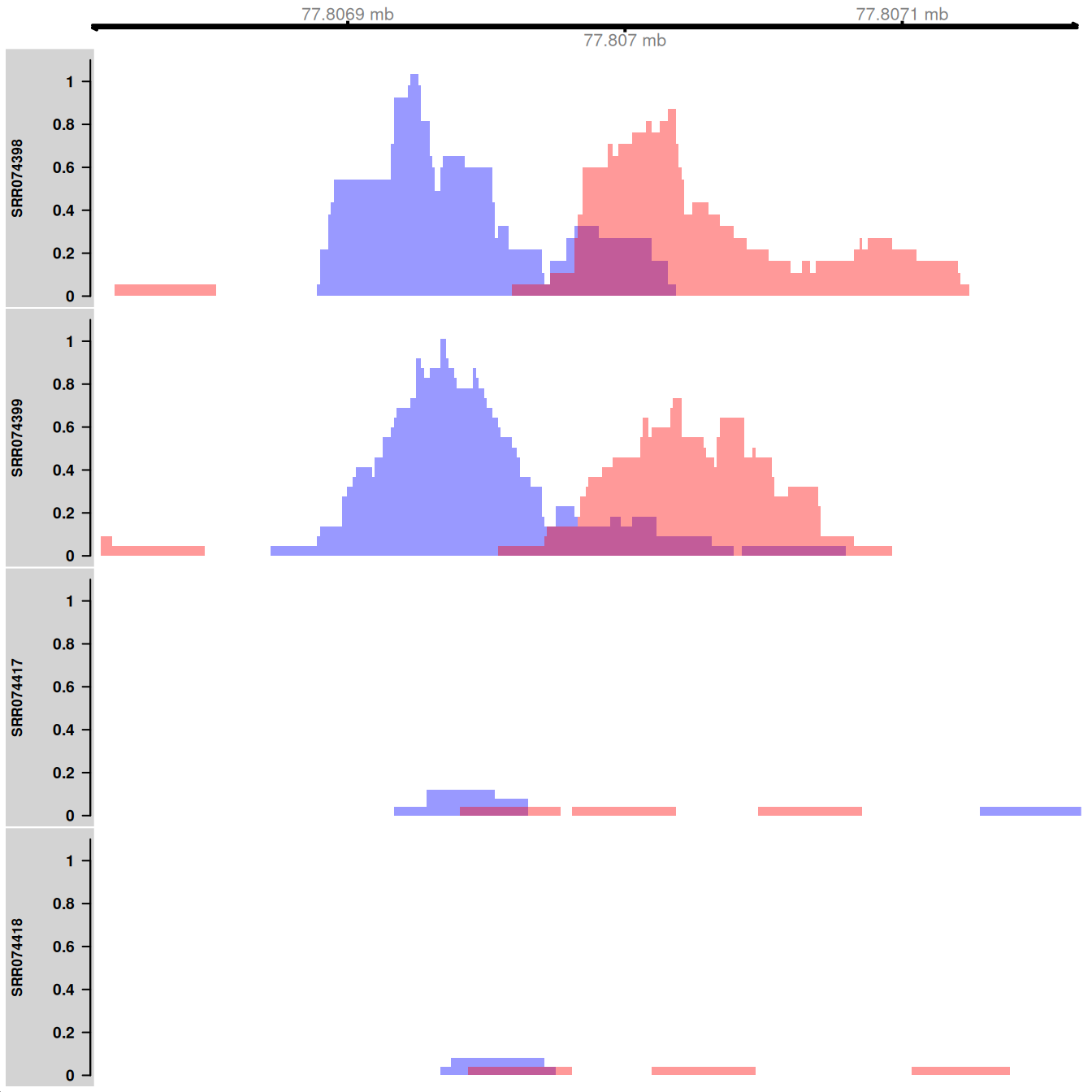 Here, coverage is visualized as the number of reads covering each base pair in the interval of interest. Specifically, the reads-per-million is shown to allow comparisons between libraries of different size. The plots themselves are constructed using methods from the Gviz package. The blue and red tracks represent the coverage on the forward and reverse strands, respectively. Strong strand bimodality is consistent with a genuine TF binding site. For paired-end data, coverage can be similarly plotted for fragments, i.e., proper read pairs.