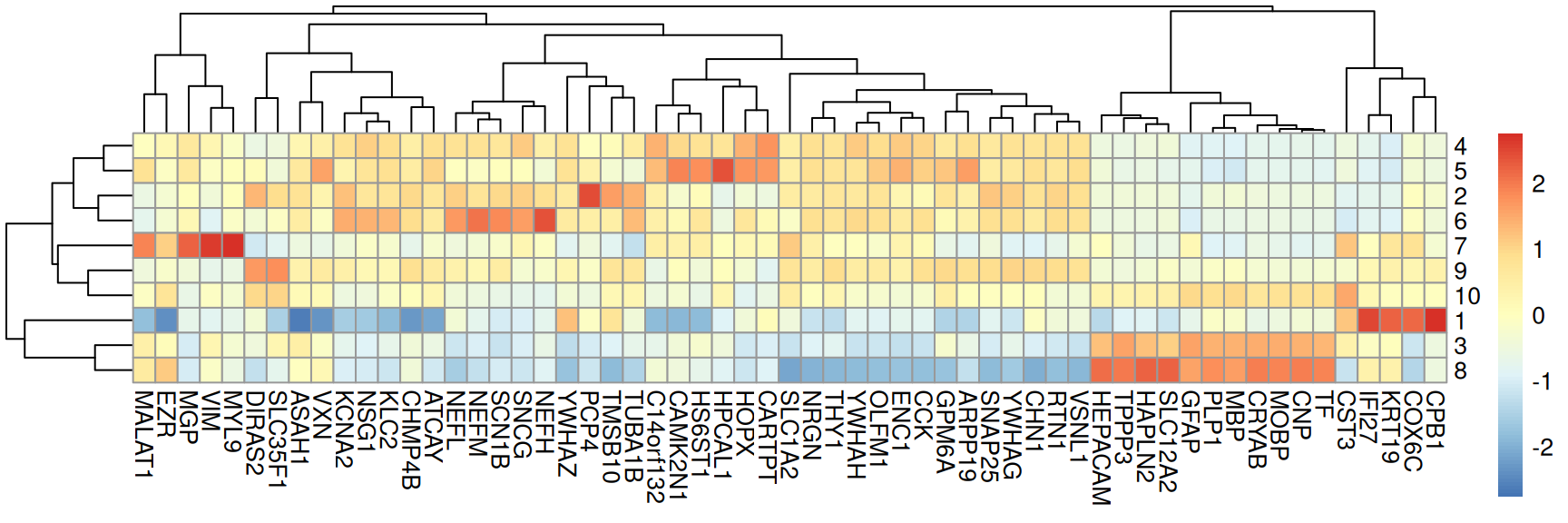 scale = "column". This will, for every gene, subtract the mean and divide by the standard deviation across per-cluster means, bringing genes of potentially very different expression levels to a comparable scale.Code