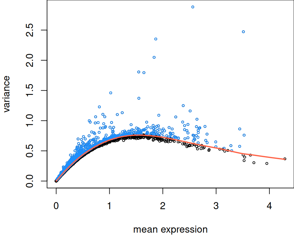 In this example, we use the scran package (Lun, McCarthy, and Marioni 2016) to identify HVGs in a two-step procedure. We first model the mean-variance relationship, which decomposes variance into a technical component (smooth fit) and biological component (deviation thereof). Secondly, HVGs may be selected based on their rank, using a fixed number n or proportion p of genes: