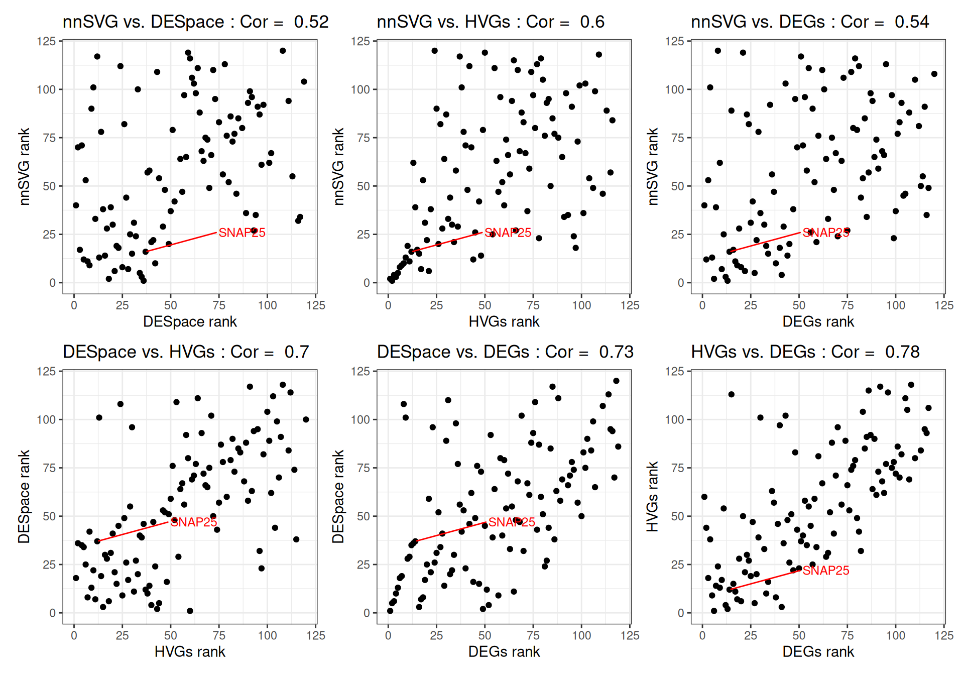 We can compare the ranks of the genes detected by each method and compute pairwise correlations, highlighting two known cortical layer-associated SVGs: MOBP and SNAP25. While all four methods - HVGs, DEGs, SVGs identified through nnSVG and DESpace - yield similar gene ranks, each method captures distinct aspects of gene expression, with varying pairwise correlations between them.