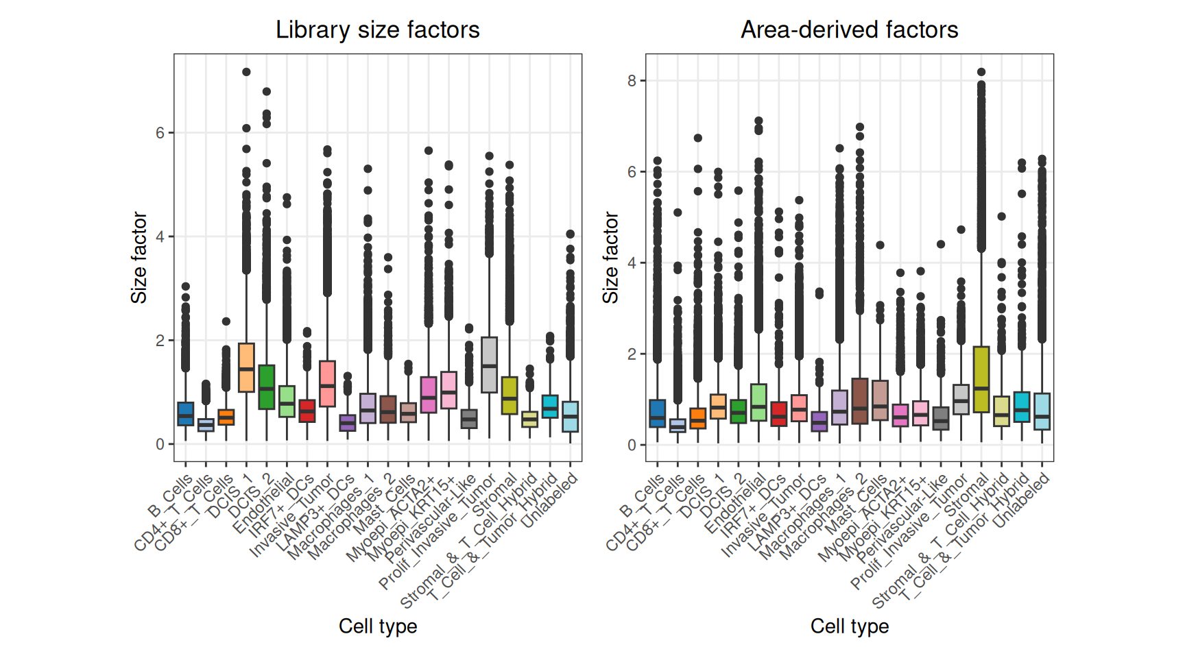We can check the distribution of library and area-derived size factors across cell types, to highlight any potential confounding: