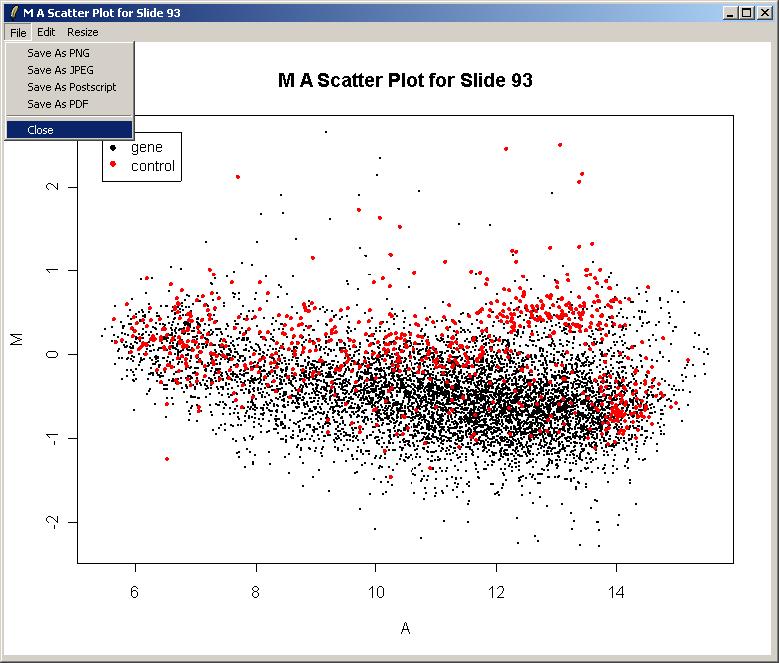 The resulting plot is shown below. There is clearly a need for normalization. There is an obvious intensity effect (i.e. M depends on A) which should be removed by normalization later on.