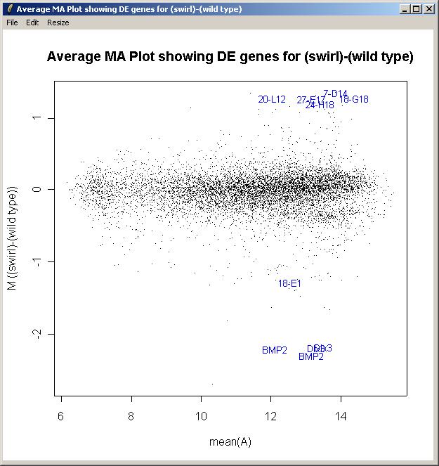 The toptable is shown below. Note that the BMP2 gene is correctly ranked at the top of the list and is down-regulated (i.e. it has a negative M value) because Swirl fish are mutant in this gene. Other positive controls appear in the top 50 genes. You can save this toptable (as tab-delimited text) or copy it to the clipboard. (If you chose to show all genes, the table will be too large to display and the spreadsheet/table window, so it will be shown in a text window instead, but it will still look exactly the same after you save it as tab-delimited text and view it in an external spreadsheet program.)