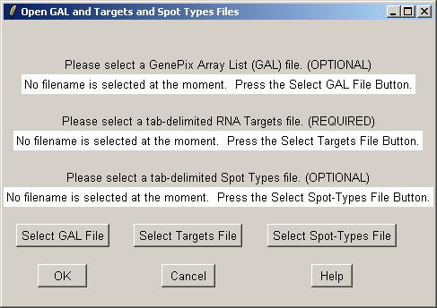 Now you can open a GAL (GenePix Array List) file, an RNA Targets file (listing the hybridizations), and a Spot Types file.