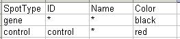 Finally, open the Spot Types file. The Spot Types file (below) should be stored in tab-delimited text which can be generated by a spreadsheet program, such as Excel. The asterisks are wildcards which can stand for anything. The rules for assigning types to spots are applied in order from top to bottom.