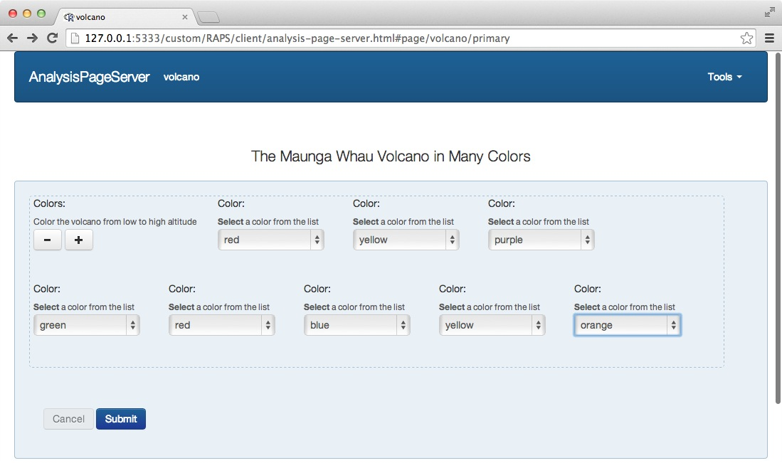 Now we can see the two arguments of the handler function, color1 and color2, have been rendered as HTML text inputs, and prepopulated with their default values. (This is default behavior, but there is a rich syntax to define complex parameters, and this is explored below.) Also note that the URL has updated. This new URL, with the suffix #page/volcano/primary, will automatically jump to the primary parameter area for the volcano page. Clicking on Submit takes us to the analysis result: