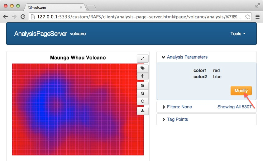 Now we can see the two arguments of the handler function, color1 and color2, have been rendered as HTML text inputs, and prepopulated with their default values. (This is default behavior, but there is a rich syntax to define complex parameters, and this is explored below.) Also note that the URL has updated. This new URL, with the suffix #page/volcano/primary, will automatically jump to the primary parameter area for the volcano page. Clicking on Submit takes us to the analysis result: