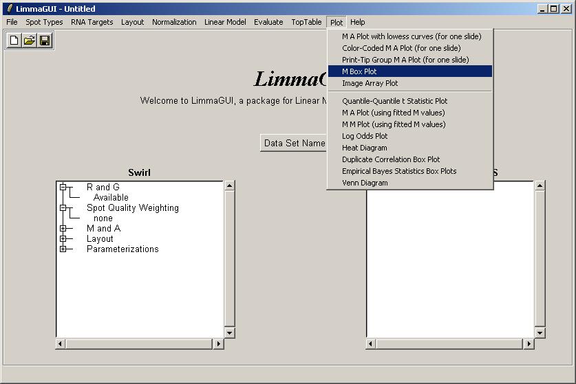 Once the data set has been loaded, its name is displayed on top of the left status window. The status window shows that Red and Green background-corrected intensities (R and G) have been loaded, and that there is no spot-quality weighting. The data set name can be later modified with the "Data Set Name" button. The data set name is not the same as the file name, displayed in the title bar. For example, the same data set (Swirl) could be saved at two different stages of the analysis, e.g. SwirlArraysLoaded.lma and SwirlLinearModelComputed.lma.