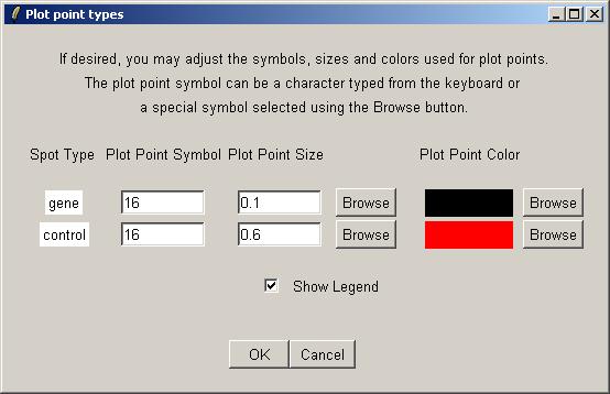 Now we can choose plot symbols, sizes and colors for the different spot types in our graph. The default spot colors are those specified in the Spot Types file. By default, the size of control points on the graph is larger than the size of gene points, because usually there are so few controls (e.g. scorecard controls) and they are important to highlight.