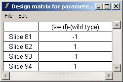 The design matrix is shown below. The matrix can be saved as tab-delimited text or copied and pasted into a spreadsheet program.