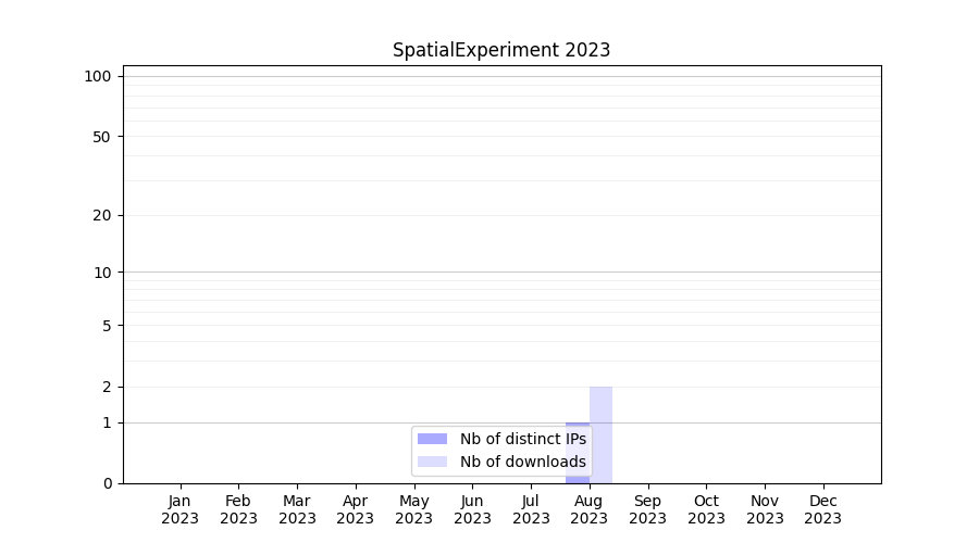 Number of downloads for annotation package SpatialExperiment, year by year, from 2025 back to 2014 (years with no downloads are omitted):