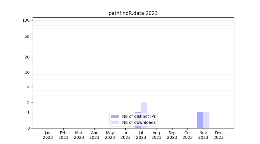 Number of downloads for annotation package pathfindR.data, year by year, from 2025 back to 2014 (years with no downloads are omitted):