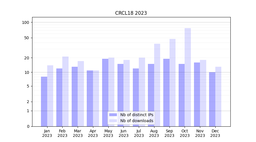 Number of downloads for experiment package CRCL18, year by year, from 2025 back to 2014 (years with no downloads are omitted):