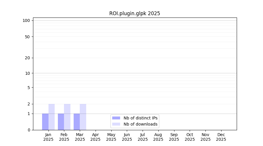 Number of downloads for experiment package ROI.plugin.glpk, year by year, from 2025 back to 2014 (years with no downloads are omitted):