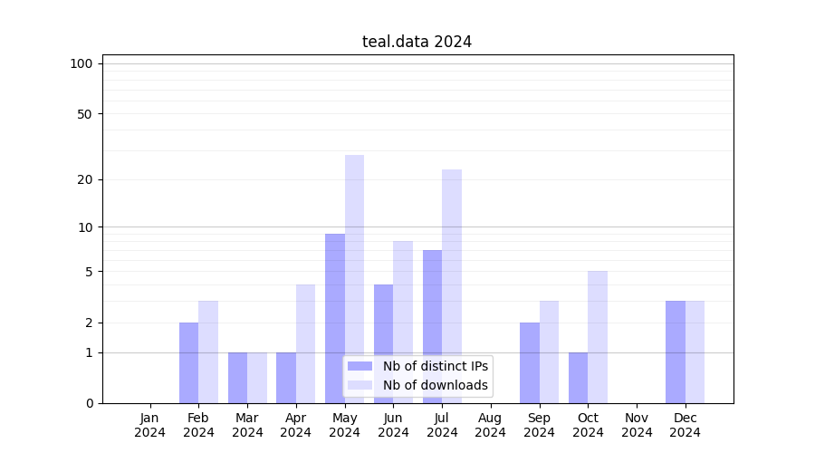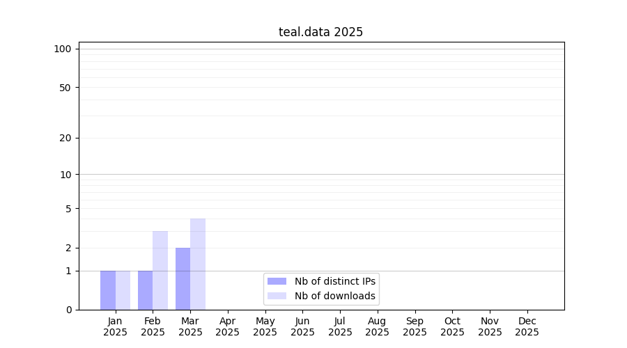Number of downloads for experiment package teal.data, year by year, from 2025 back to 2014 (years with no downloads are omitted):