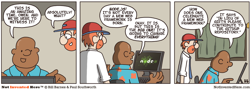 All development takes place at http://github.com/joyent/node. The comments on commit messages are often source of heated discussion regarding core development. The GitHub Node wiki is full of useful links for newcomers. Don't miss Projects, Applications, and Companies Using Node or the very long list of Node modules, many of which are published in the npm registry.