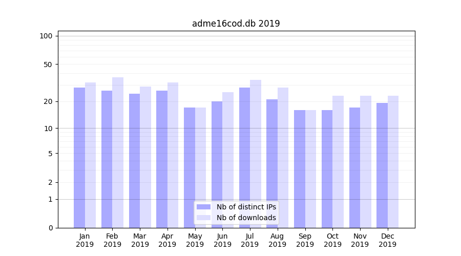 Number of downloads for annotation package adme16cod.db, year by year, from 2025 back to 2014 (years with no downloads are omitted):
