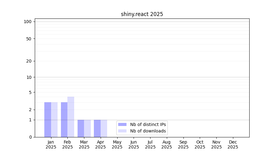 Number of downloads for experiment package shiny.react, year by year, from 2025 back to 2014 (years with no downloads are omitted):