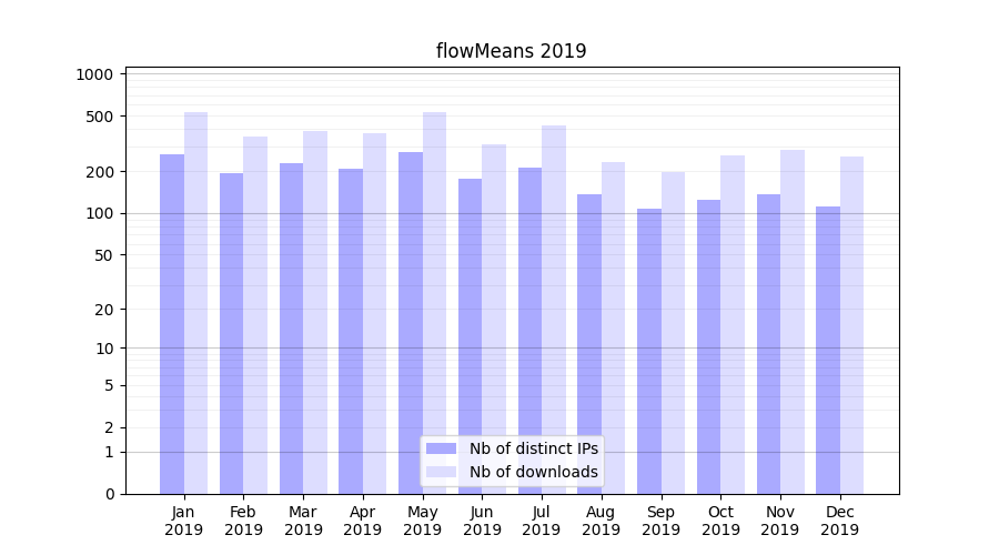 Number of downloads for software package flowMeans, year by year, from 2025 back to 2014 (years with no downloads are omitted):