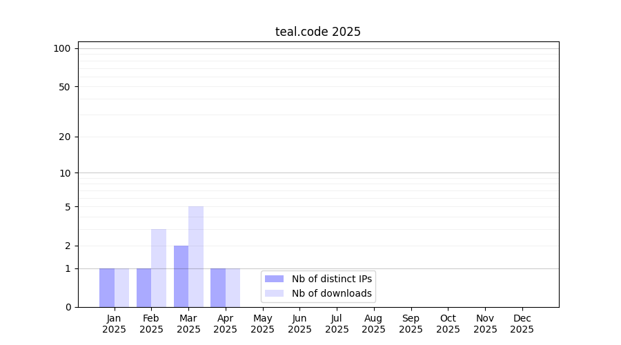 Number of downloads for software package teal.code, year by year, from 2025 back to 2014 (years with no downloads are omitted):
