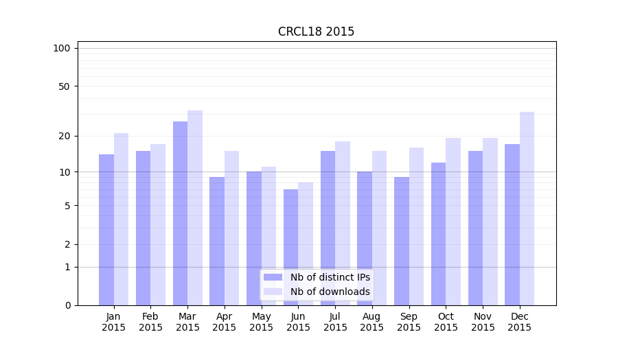 Number of downloads for experiment package CRCL18, year by year, from 2025 back to 2014 (years with no downloads are omitted):