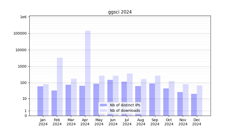 Number of downloads for experiment package ggsci, year by year, from 2025 back to 2014 (years with no downloads are omitted):