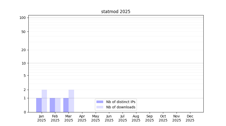 Number of downloads for experiment package statmod, year by year, from 2025 back to 2014 (years with no downloads are omitted):